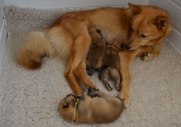 Tuuli, with her 3 puppies born on Sunday 18th May 2014