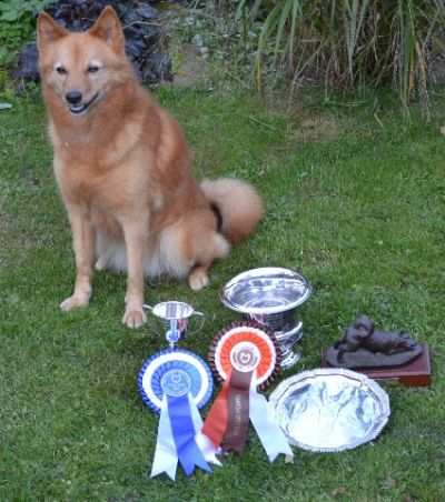 She gained her first Challenge Certificate at Bournemouth dog show in August 2005. After a break from showing for a few years, she won her second CC at the Finnish Spitz Club Championship Show on 2nd October 2010, and her third CC at Manchester Championship Show on 20th January 2011 to become a Champion. She won a 4th CC at the Finnish Spitz Club Championship Show on 1st October 2011.