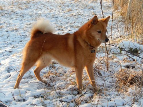 Tuuli was mated in Finland in mid March 2014 with a Finnish dog registered as Ake (but known also by his 'pet' name of "Rehju"). He was suggested as sire by the Breeding Adviser of the SPJ (Spitz Breeds Club of Finland).